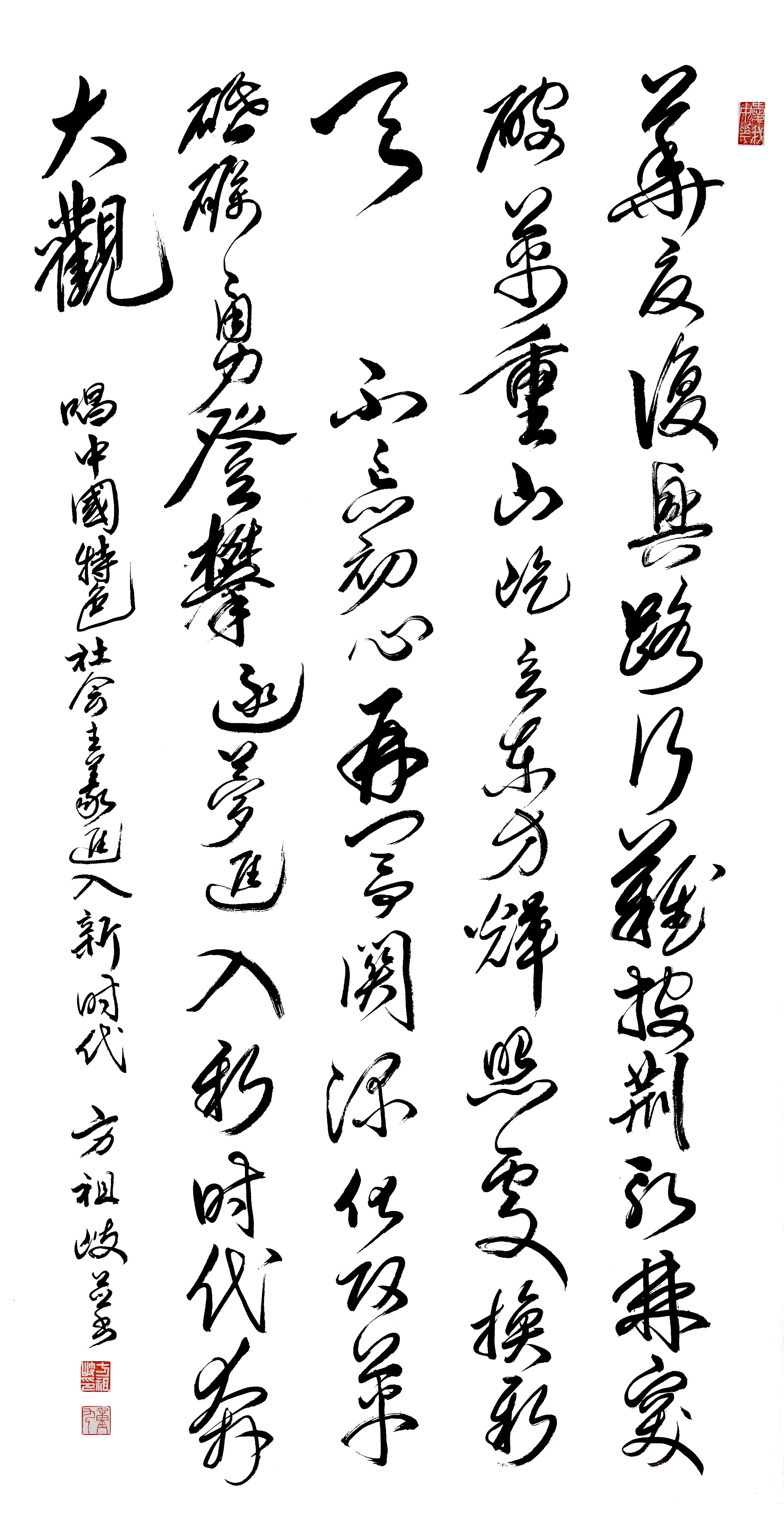 方祖琪的书法作品《华夏复兴路 进入新时代》抒发了华夏复兴之路中遇到的艰辛与不易,笔势流畅,雄浑苍茫。当曙光照进新时代,不忘初心、牢记使命的教诲依旧响彻在耳边。