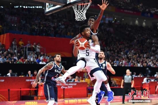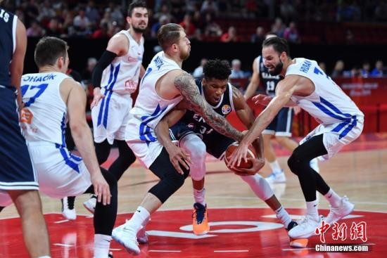 9月7日晚,在深圳进行的2019年国际篮联篮球世界杯第二轮K组的一场比赛中,美国队(白)以69比53战胜希腊队(蓝)。中新社记者 陈文 摄