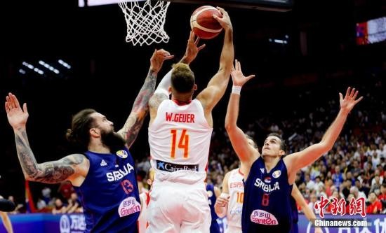 9月8日晚,2019篮球世界杯复赛J组比赛在武汉继续进行,西班牙队以81-69战胜塞尔维亚队,获得小组头名。图为西班牙球员威·埃尔南戈麦斯(中)篮下强攻。中新社记者 张畅 摄