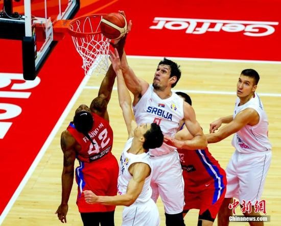 实力强大的塞尔维亚以90-47战胜波多黎各。图为塞尔维亚球员马扬诺维奇(中)篮下封盖。中新社记者 张畅 摄