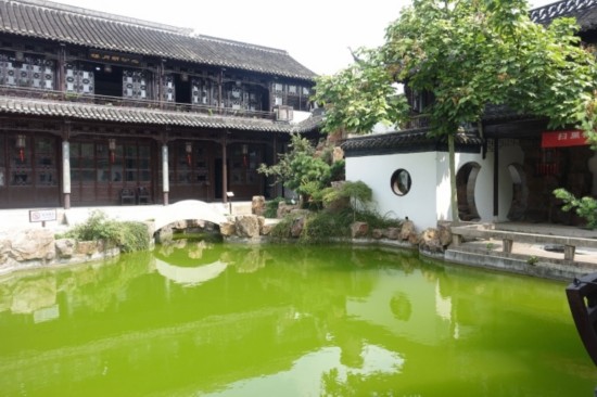 赏月楼,又名怡萱楼,原是园主人为母亲建造的居所,这里古典趣味浓郁,小楼、假山、古木、佛堂、香炉、月色;楼上铁栏杆刻有“延年益寿”图样。