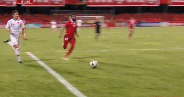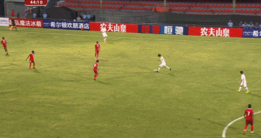 第11分钟,吴曦禁区前沿挑传,艾克森插上拿球,禁区内调整两步后未能甩开对手的后卫,最后在对手的封堵下,皮球直接出了底线。