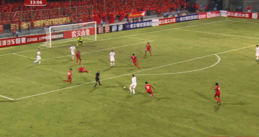 第34分钟,武磊左路将球分给李磊,李磊的传中被破坏,随后艾克森拿球连续突破后,再将球回给左路的李磊,李磊弧线球传中再送到门前,吴曦拍马赶到头球轻轻一甩,皮球钻入死角,国足终于打破僵局,1-0。