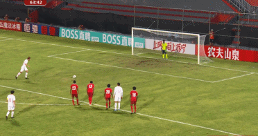 第74分钟,蒿俊闵禁区右侧拿球,被对手后卫飞铲放倒,李磊出人意料开出低平球送到点球点附近,但武磊插上第一时间未能将球停住,随后的射门软绵无力,皮球被解围后落到禁区前沿的池忠国脚下,最后的一脚爆射由于角度太正,被马代门将奋力扑出。
