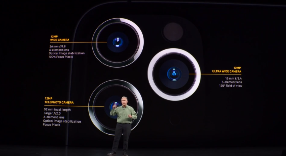 相机方面,iPhone 11 Pro如之前外界预测的一样提供三摄配置,三颗摄像头被粗暴的放在摄像头模块当中,难怪被网友戏称为“浴霸”。具体来说,其中一颗为1200万像素广角镜头、另一个为1200万像素超广角镜头、最后一颗为1200万像素长焦镜头。通过它们的组合和系统算法加持,iPhone 11 Pro可以提供更多拍摄创新玩法,与iPhone 11一样支持。视频拍摄方面,iPhone 11 Pro提供4K 60fps视频拍摄能力。