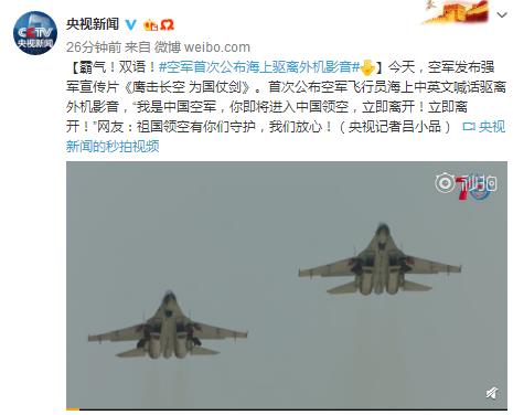 今天,空军发布强军宣传片《鹰击长空 为国仗剑》。首次公布空军飞行员海上中英文喊话驱离外机影音,“我是中国空军,你即将进入中国领空,立即离开!立即离开!”网友:祖国领空有你们守护,我们放心!(央视记者吕小品)