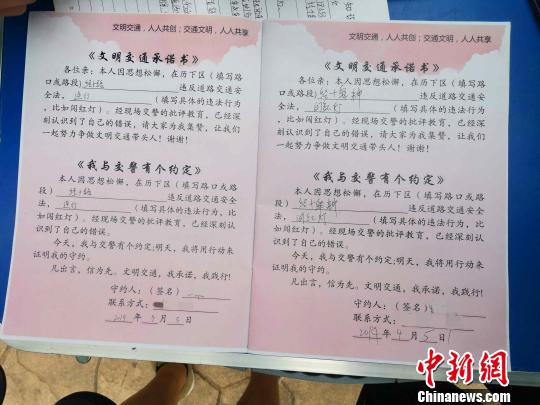 图为违法者写的签写《文明交通承诺书》和《我与交警有个约定》守约书。 郝学娟 摄