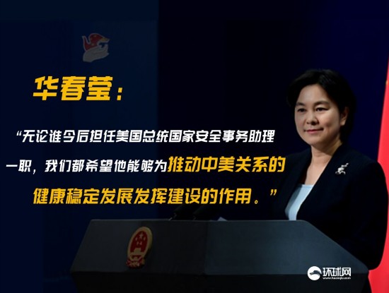 华春莹表示,美国政府人事的变动是美国的内政,中方不做评论。正如中方一再强调的,中美关系保持稳定发展符合中美两国人民的根本利益,也是国际社会的共同期待。“无论谁今后担任美国总统国家安全事务助理一职,我们都希望他能够为推动中美关系的健康稳定发展发挥建设的作用。”