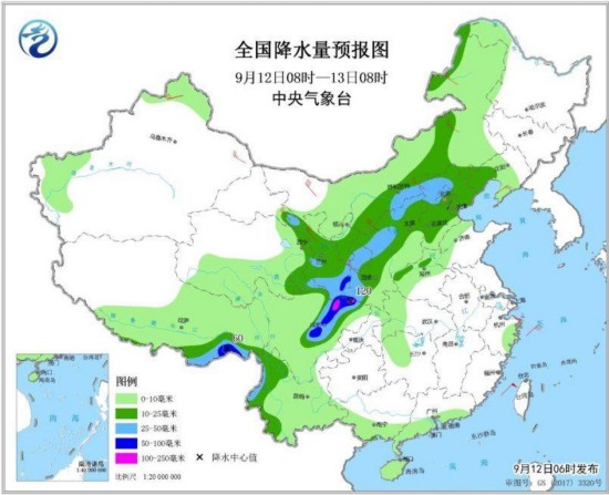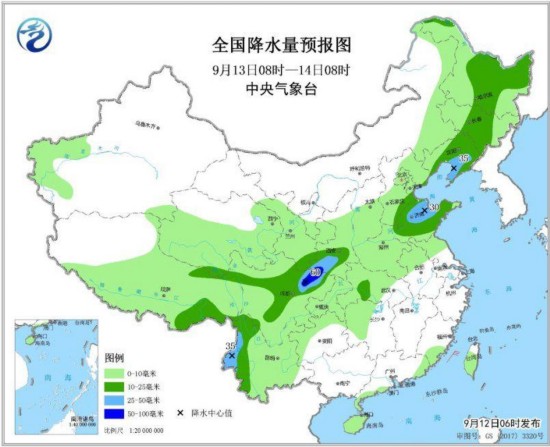 9月12日08时至13日08时,西北地区中东部、华北中南部、辽宁西部、四川盆地北部和中西部、云南西部及西藏东南部等地的部分地区有中到大雨,其中,甘肃东南部、陕西西南部、四川盆地西部等地局地有暴雨或大暴雨(100~120毫米)。