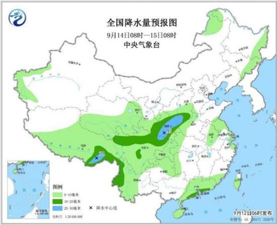 9月14日08时至15日08时,山西西南部、陕西中南部、甘肃南部、四川北部、云南西部、西藏南部等地的部分地区有中到大雨(25~45毫米)。
