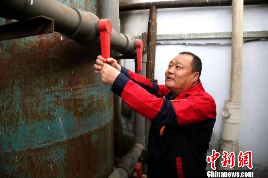 供热工人打开锅炉注水阀门,为锅炉补水。冯宏伟 摄