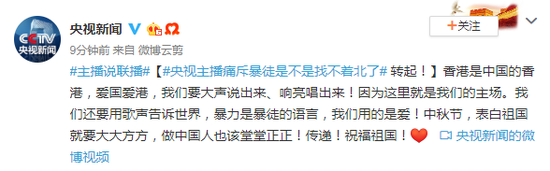 香港是中国的香港,爱国爱港,我们要大声说出来、响亮唱出来!因为这里就是我们的主场。我们还要用歌声告诉世界,暴力是暴徒的语言,我们用的是爱!中秋节,表白祖国就要大大方方,做中国人也该堂堂正正!传递!祝福祖国!