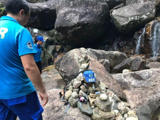 台风过后,白马山又恢复了宁静。溪谷里的两处水潭边,垒起了两座小石堆。石堆前,摆了两个带有蓝天救援标志的帽子。