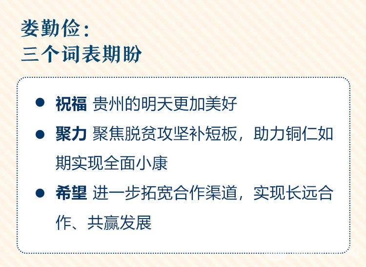 娄勤俭代表省委、省政府对贵州省党政代表团表示热烈欢迎,对多年来贵州给予江苏发展的支持帮助表示衷心感谢。他说,近年来江苏认真贯彻习近平新时代中国特色社会主义思想,深入落实习近平总书记对江苏工作的重要指示要求,努力推动高质量发展走在前列,切实扛起对口扶贫政治责任,坚决把中央决策部署落到实处。江苏与贵州虽然相隔千里,但联系源远流长,特别是2013年中央明确苏黔结对以来,两省协作成果越来越丰硕、合作越来越密切、感情越来越深厚。娄勤俭用三个词表达了对贵州发展、脱贫攻坚、两省合作的期盼。一是祝福,近年来贵州经济社会发展成效显著,我们相信,有习近平新时代中国特色社会主义思想定向领航,有贵州省委省政府坚强领导、全省人民共同奋斗,贵州的明天一定会更加美好。二是聚力,要聚焦脱贫攻坚补短板,支持苏州从资金支持、产业合作、劳务协作、人才支援等方面加大精准帮扶力度,助力铜仁如期实现全面小康。三是希望,双方要进一步拓宽合作渠道,特别要在产业、开放、文旅等方面加大合作力度,实现长远合作、共赢发展。娄勤俭说,贵州有一首民歌叫《好花红》,江苏也有一首民歌叫《茉莉花》,我们坚信,在以习近平同志为核心的党中央坚强领导下,两省携手并进,合作发展,老百姓的日子一定会像歌中所唱的花朵那样繁荣美好、红红火火。