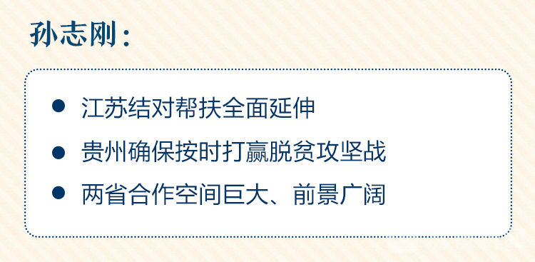 孙志刚代表贵州省委、省政府和全省人民对江苏长期以来的帮助表示衷心感谢。他说,江苏坚持以习近平新时代中国特色社会主义思想为指导,围绕“强富美高”新江苏建设,在产业转型升级、改革开放创新、生态文明建设等方面取得了显著成绩,高质量发展势头强劲,创造了许多好经验好做法,非常值得贵州深入学习借鉴。江苏省委省政府高度重视帮扶贵州,投入力度持续加大,结对帮扶全面延伸,产业合作深入推进,帮扶干部作风扎实,扶贫协作成效显著,有力促进了贵州脱贫攻坚和经济社会发展,贵州人民始终铭记、永远感激。贵州深入贯彻落实习近平总书记重要指示精神,牢记嘱托、感恩奋进,把夺取脱贫攻坚全面胜利作为践行初心使命的具体体现,作为重大政治责任、光荣使命、难得机遇,纵深推进农村产业革命,着力解决“两不愁三保障”突出问题,扎实开展“五个专项治理”,猛攻深度贫困堡垒,确保尽锐出战、务求精准,按时打赢脱贫攻坚战。贵州和江苏合作空间巨大、前景广阔,希望深入开展农业协作,强化教育、医疗、劳务协作,拓展园区合作领域,深化旅游合作,促进互利共赢、共同发展。