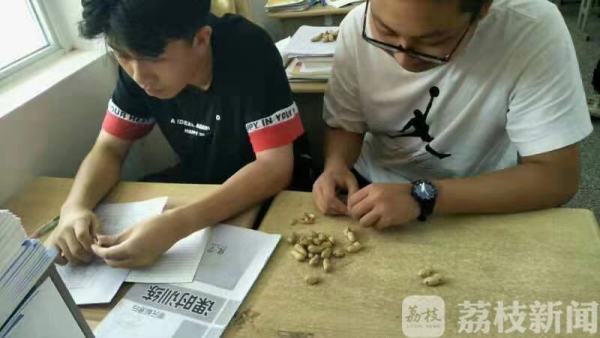 花生摘完了。同学们把一筐筐花生抬进学校食堂。午餐后,食堂将煮好的花生送到各班,大家品尝自己的劳动果实,越吃越香。