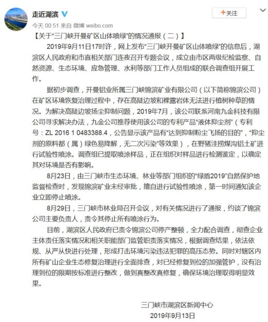 通报称,2019年9月11日17时许,网上发布“三门峡开曼矿区山体喷绿”的信息后,湖滨区人民政府和市直相关部门连夜召开专题会议,成立由市区两级纪检监察、自然资源、生态环境、应急管理、水利等部门工作人员组成的联合调查组开展工作。