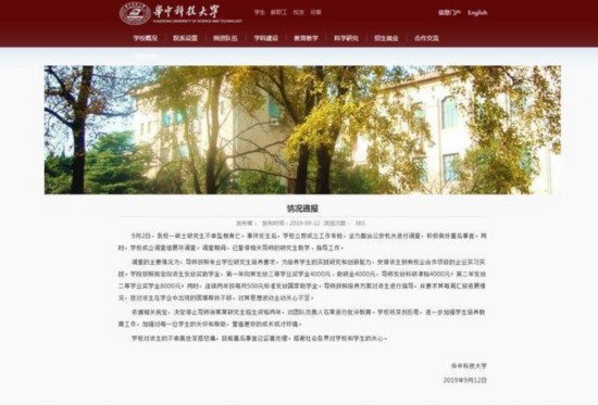 荔枝新闻讯 针对华中科技大学硕士研究生跳楼事件,9月12日,华中科技大学发布校方通报。