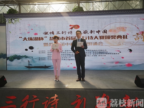 位于泰州和盐城之间的大纵湖,是苏北里下河地区最大、最深的湖泊,也是全省地势最低洼的地区之一,因此又名平湖。这里自古为文人骚客泛舟徒步游览的胜地,“平湖秋月”“纵湖秋色”分别为盐城古八景、新八景之一。“在中秋佳节来临之际,我们在芦苇茂盛、野鸟翔集、环境优美的大纵湖畔举行中秋诗歌朗诵会,在诗意的环境中一起吟诵意蕴隽永的传统佳作,是一种特别的享受,特别富有意义!”盐城市委宣传部副部长薛万昌在现场表示,盐城是一座历史悠久的城市,拥有新四军文化、海盐文化、生态文化和海洋文化,深厚的文化底蕴为三行诗的创作提供了丰富的源泉。盐城市首届三行诗大赛的举办,有利于展现盐城70年来政治、经济、文化所取得的巨大成就,对繁荣地方文化具有十分重要的意义。