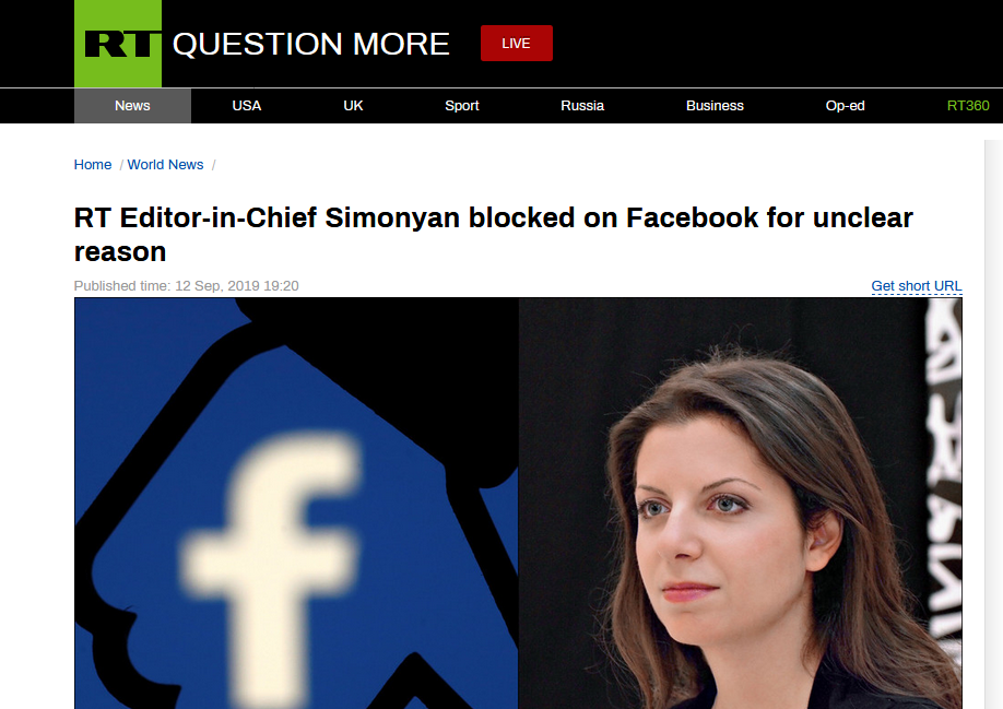 “RT主编西蒙尼扬的脸书账号被封,原因不明”。“今日俄罗斯”(RT)12日以此为题爆料说,社交媒体平台脸书日前以涉嫌“违反社区标准”为由,封锁了西蒙尼扬的账户。RT称,西蒙尼扬本人透露了这一消息,同时对脸书上无处不在的审查制度表示不满。