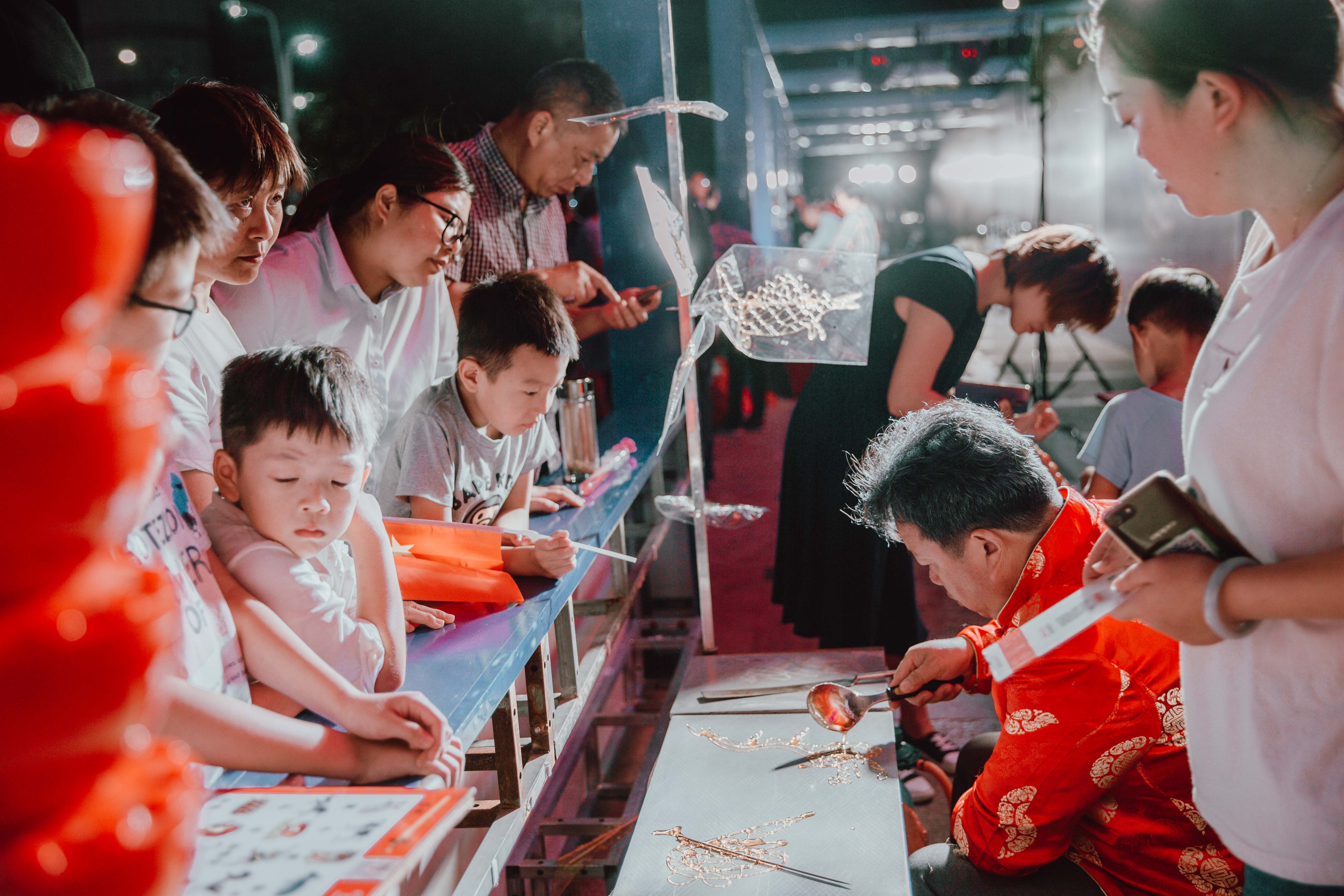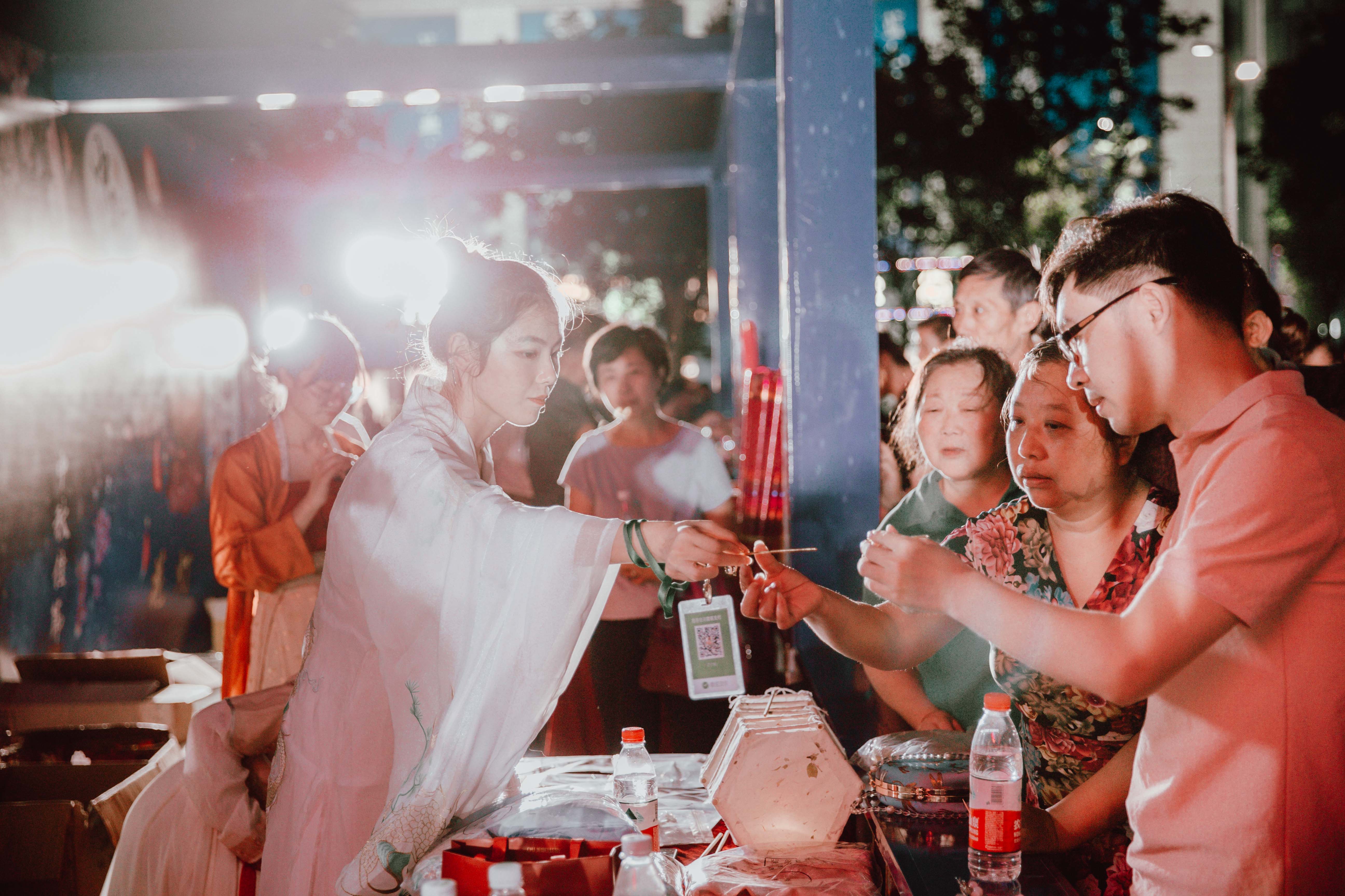 主题展示区设置了嫦娥奔月、吴刚伐桂、玉兔捣药、霓裳羽衣、月下独酌、合家团圆、拜月祈福、燃灯摸秋等八个主题板块,洋溢着浓浓的传统文化气息;互动游戏区设置了诗词抢答、画月饼等小游戏,吸引现场群众的踊跃参与;民间特色展示区的月饼、玉兔、糖画、你人等特色商品琳琅满目……