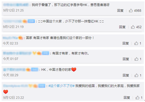 在《人民日报》微博评论区,有大陆网友也看出了其中含义,并表示:中国这个大家,少不了你那一抹橙红HK;国家,有国才有家,香港也是我们这个家的一部分;我爱祖国,我爱我家↓