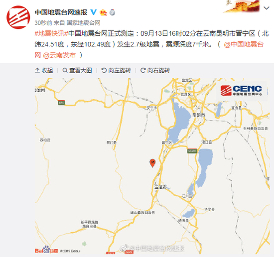 荔枝新闻讯 据中国地震台网正式测定:09月13日16时02分在云南昆明市晋宁区(北纬24.51度,东经102.49度)发生2.7级地震,震源深度7千米。