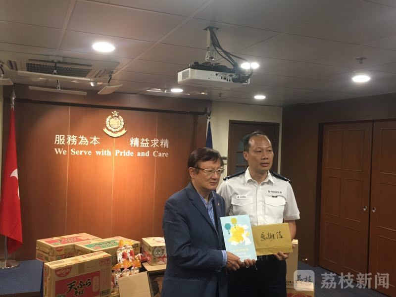 慰问活动上,江苏旅港同乡联合会会长马忠礼将慰问信和心意卡片,交到旺角警署工作人员手中。“心意卡上有我们江苏旅港同乡联合会的logo,同乡会下有25个属会,都将会一直支持香港警察。”马忠礼说,止暴制乱,支持警察,不仅是在精神上,还要在物质上。此次慰问活动,联合会送来了月饼、方便面、香肠等,以方便警员们在紧张的工作之余充饥。