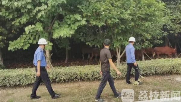 西湖街道综合执法办队员周禹泽一边看着这几头牛,一边向领导汇报情况,很快,队友们赶来帮忙,问了周边的村民,都说不晓得,后来还是一名环卫工人提供线索,说之前在一块拆迁的空地上看见几头黄牛,会不会是从那里跑出来的呢?