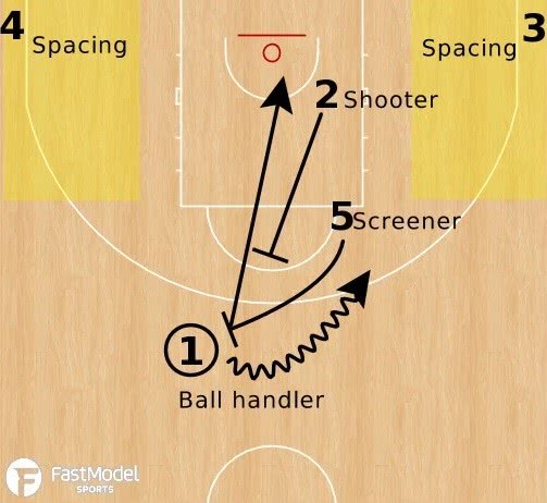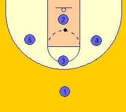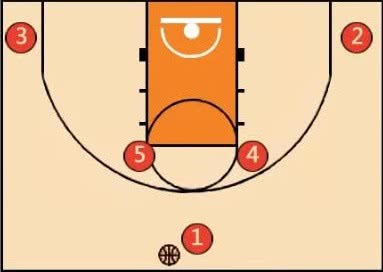 如图所示,由1号球员持球,5号球员上前掩护后再顺下准备接球,这是传统挡拆的基本模型。西班牙挡拆的加成在于,5号球员顺下的过程中,原本位置接近篮下的2号球员为他完成第二次掩护,形成更多的战术变化。