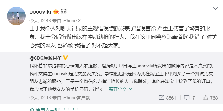 随后,微博网友@ooooviki及其男友@CDC厘源月笙也于14日分别发文道歉,截图如下: