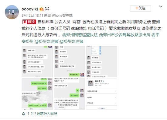 9月12日,微博网友@ooooviki 发文称,其个人信息疑遭“网警”查询,对方要求其做女友,遭拒后对她进行人身攻击。