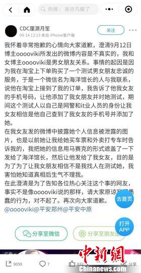 图为女子男友发布事件经过及公开道歉 微博截图