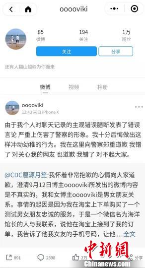 图为女子发布消息向警方及网友道歉 微博截图