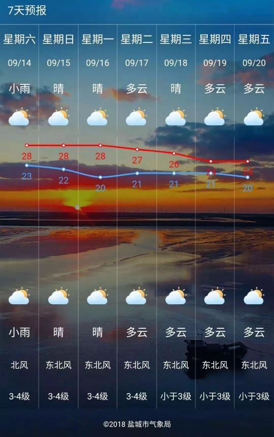 今天多云到阴有阵雨,东北风4级左右。今天最高气温27到28度,明晨最低气温22度左右。