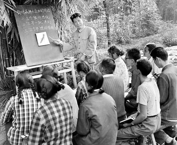四川医学院钩端螺旋体病防治研究室的教师和医务人员,长期坚持钩体病防治研究工作,取得显著成效。这是1977年10月,从事钩体病研究20多年的该室主任戴保民,在给峨眉县胜利公社胜利大队的赤脚医生讲解钩体病的防治。新华社记者 金勖琪 摄