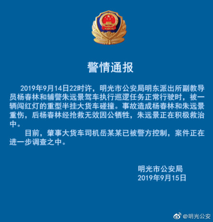 新京报快讯 据安徽省明光市公安局官方微博消息,明东派出所2民警驾车巡逻时被一辆闯红灯的大货车碰撞。事故造成1人牺牲,1人重伤。司机已被警方控制,案件正在调查中。