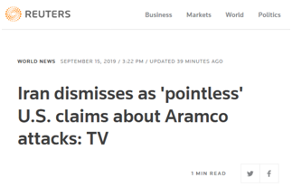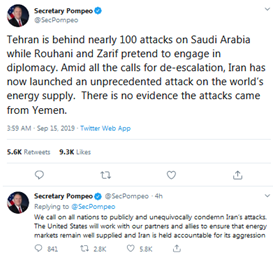 当地时间14日,沙特国家石油公司阿美的两处重要石油设施遭无人机袭击并发生火灾,也门胡塞武装宣称对此负责后不久,美国国务卿蓬佩奥当天直接在推特将“矛头”指向伊朗,“狠批”德黑兰是“幕后黑手”,称伊朗“对世界能源供应发起了前所未有的攻击”,还表示没有证据显示此次袭击来自也门。