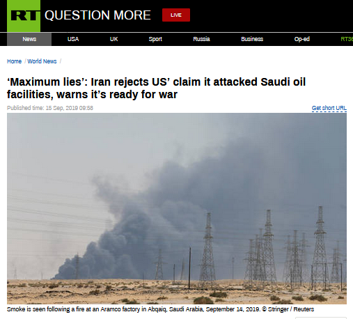 在“今日俄罗斯”(RT)的报道中,穆萨维当天还直言有关伊朗是无人机袭击沙特石油设施“幕后黑手”的说法是“毫无根据的”,是错误的。他还说,美国官员指责伊朗是为了在世界舞台上抹黑其形象,准备对德黑兰采取“未来行动”。
