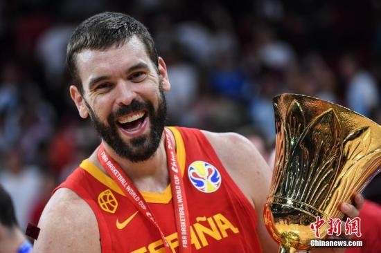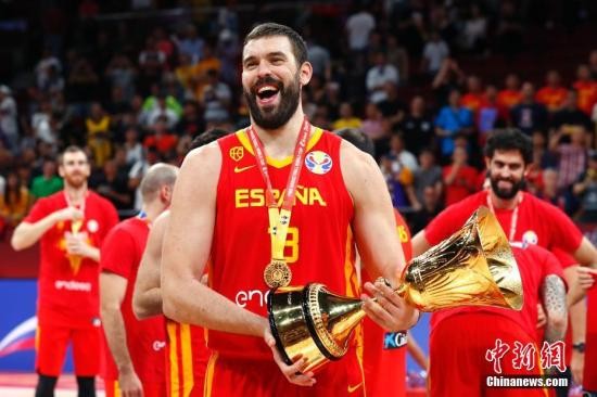 9月15日,2019男篮世界杯决赛在北京举行,西班牙队以95比75战胜阿根廷队,取得本届男篮世界杯冠军。图为西班牙队球员小加索尔举起奖杯。中新社记者 崔楠 摄