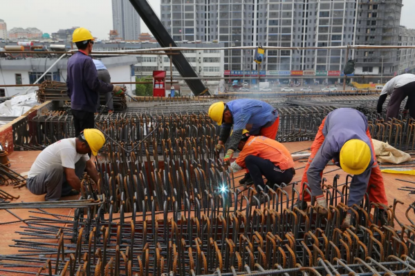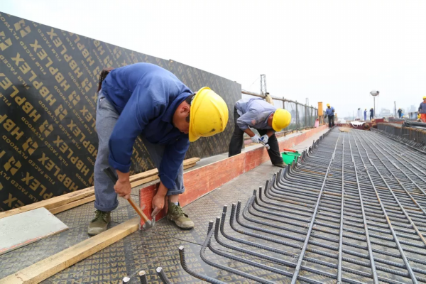 在施工现场小编看到,连续梁支架高达12米,近百名施工人员放弃节日假期,正在支架上方进行顶板钢筋的安装、绑扎和焊接等工作。据了解,连徐高铁建设路连续梁施工的总长度为177.5米,分7个节段进行施工,目前,其中一个节段已经完成了顶板混凝土的浇筑,为接下来的无渣轨道铺设奠定了基础。