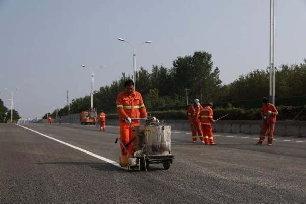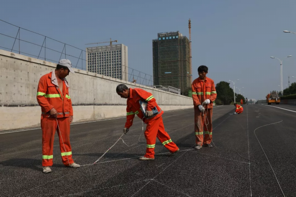 目前,南京路立交桥西半幅的路面上已经画好了交通标志标线,接下来将开放西半幅的交通,再将东半幅封闭起来,对其路面系统进行进一步地加强。
