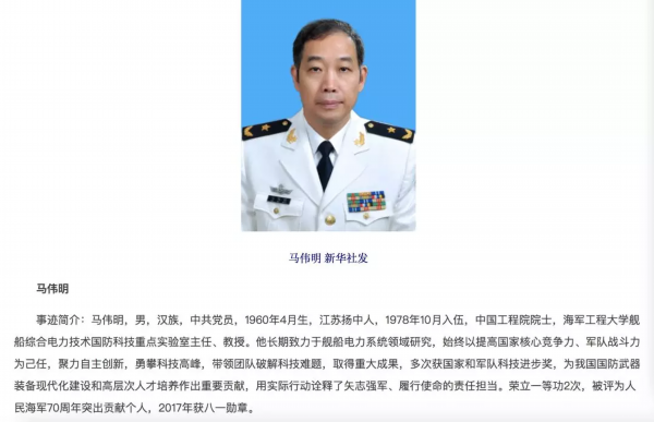马伟明 男,汉族,中共党员,1960年4月生,江苏扬中人,1978年10月入伍,中国工程院院士,海军工程大学舰船综合电力技术国防科技重点实验室主任、教授。