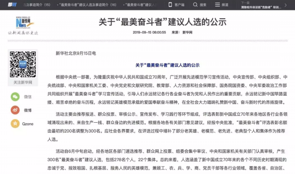 根据中央统一部署,为隆重庆祝中华人民共和国成立70周年,广泛开展先进模范学习宣传活动,中央宣传部、中央组织部、中央统战部、中央和国家机关工委、中央党史和文献研究院、教育部、人力资源和社会保障部、国务院国资委、中央军委政治工作部共同组织开展“最美奋斗者”学习宣传活动。