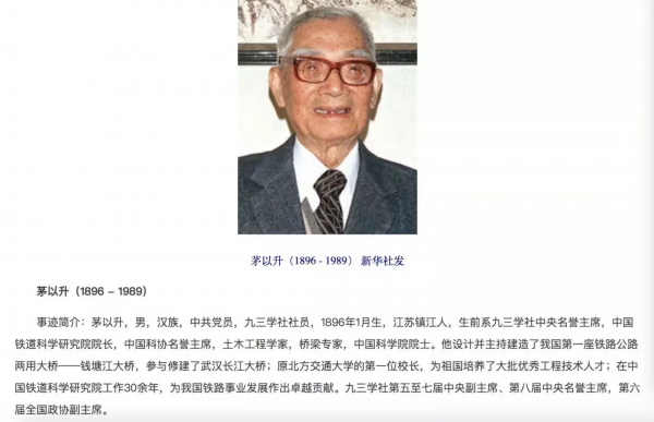 茅以升(1896 - 1989) 男,汉族,中共党员,九三学社社员,1896年1月生,江苏镇江人,生前系九三学社中央名誉主席,中国铁道科学研究院院长,中国科协名誉主席,土木工程学家,桥梁专家,中国科学院院士。