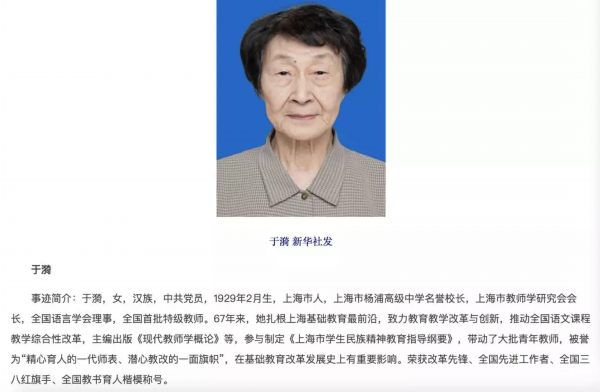 于漪 女,汉族,中共党员,1929年2月生,上海市人,上海市杨浦高级中学名誉校长,上海市教师学研究会会长,全国语言学会理事,全国首批特级教师。