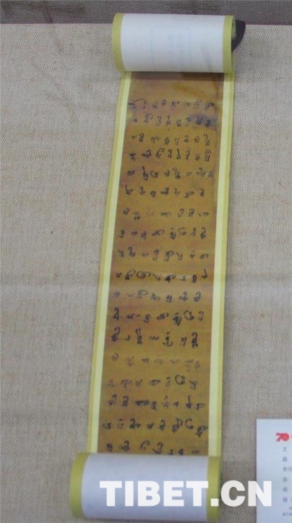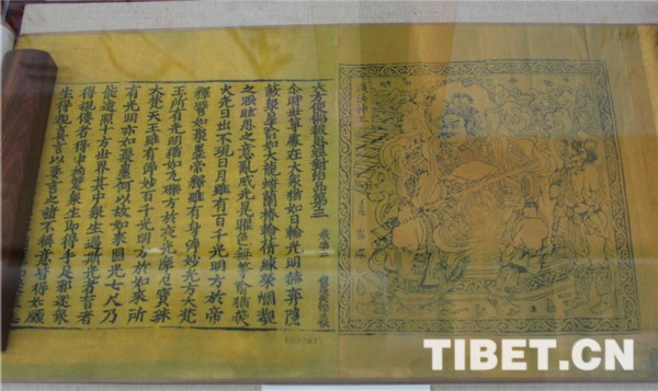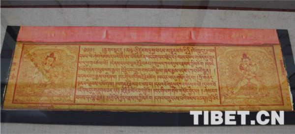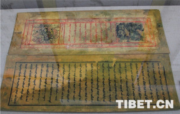 藏文创制于公元7世纪的松赞干布时代,在历史上经历了3次文字厘定,藏文古籍数量非常丰富。大藏经《甘珠尔》清康熙三十九年(1700年)北京刻本,入选国家珍贵古籍名录,此版大藏经出自清王室官本,刻造、装帧颇为精良,版型较一般藏文大藏经大,每夹扉画均为手工绘制,笔触细腻,设色鲜丽,为佛教思想文化研究的重要资料。图为展品大藏经《甘珠尔》(复制件)