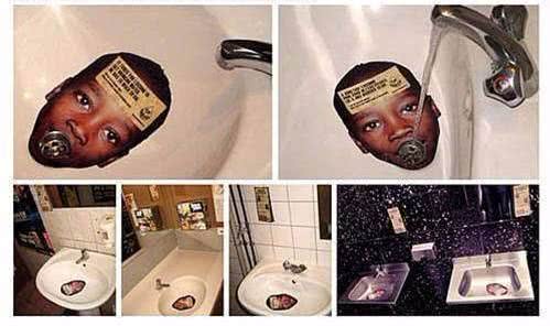 曹雪讲学时,曾多次用相关的经典案例去阐释。例如这是一则公益广告,看似很简单,贴了一个非洲儿童,讲述非洲缺水的环境,但贴在公共场合的水池里面,告诉洗手的人们这位非洲儿童饥渴、缺水,在洗手的时候手下留情。