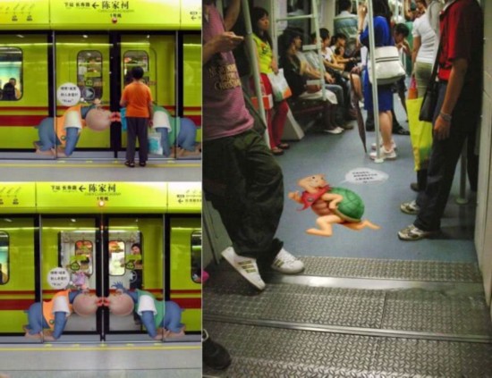 这是曹雪指导学生为广州长隆野生动物园做的一套地铁广告,一般野生动物园在市郊,贴张海报,某月某日动物嘉年华,请你到郊区看动物。而这个的设计理念在于,广告反过来做,让动物进城来看你。新的龟兔赛跑的故事,乌龟乘坐速度较快的地铁,而兔子却在地上堵着。