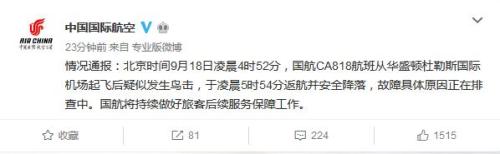 中国国际航空公司官方微博18日发布通报称,北京时间9月18日凌晨4时52分,国航CA818航班从华盛顿杜勒斯国际机场起飞后疑似发生鸟击,于凌晨5时54分返航并安全降落,故障具体原因正在排查中。国航将持续做好旅客后续服务保障工作。